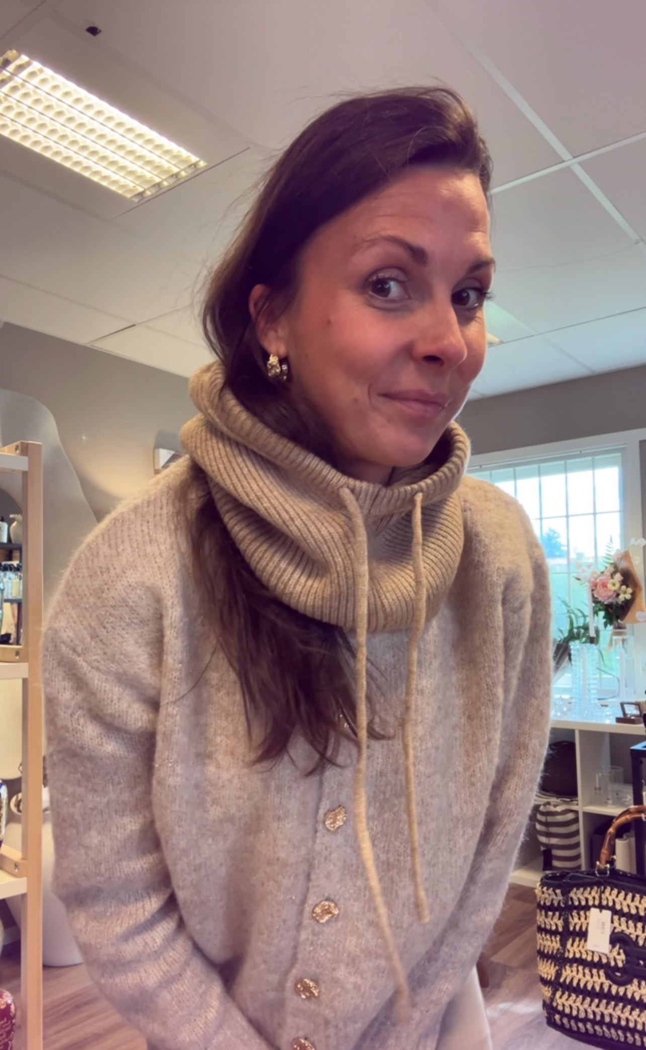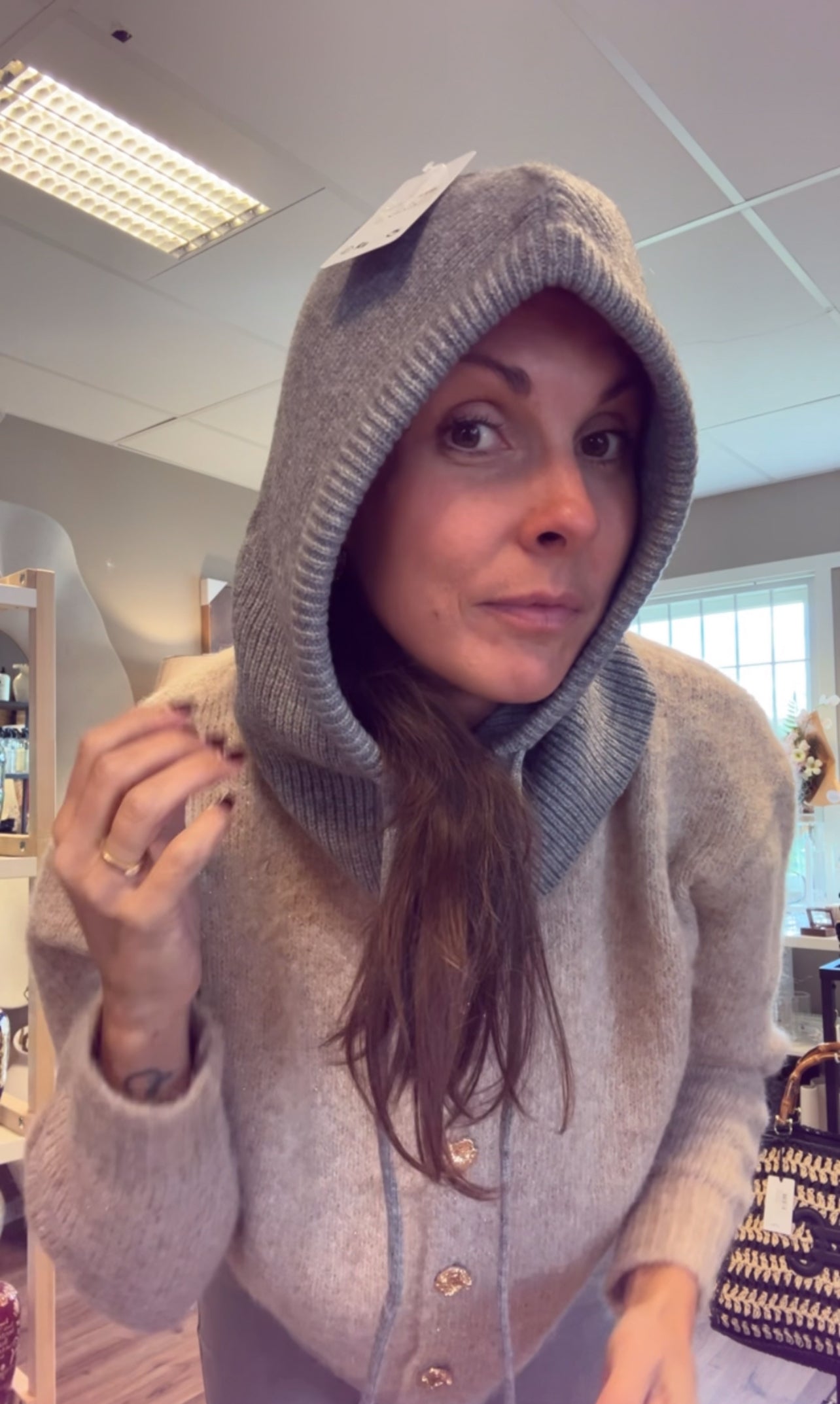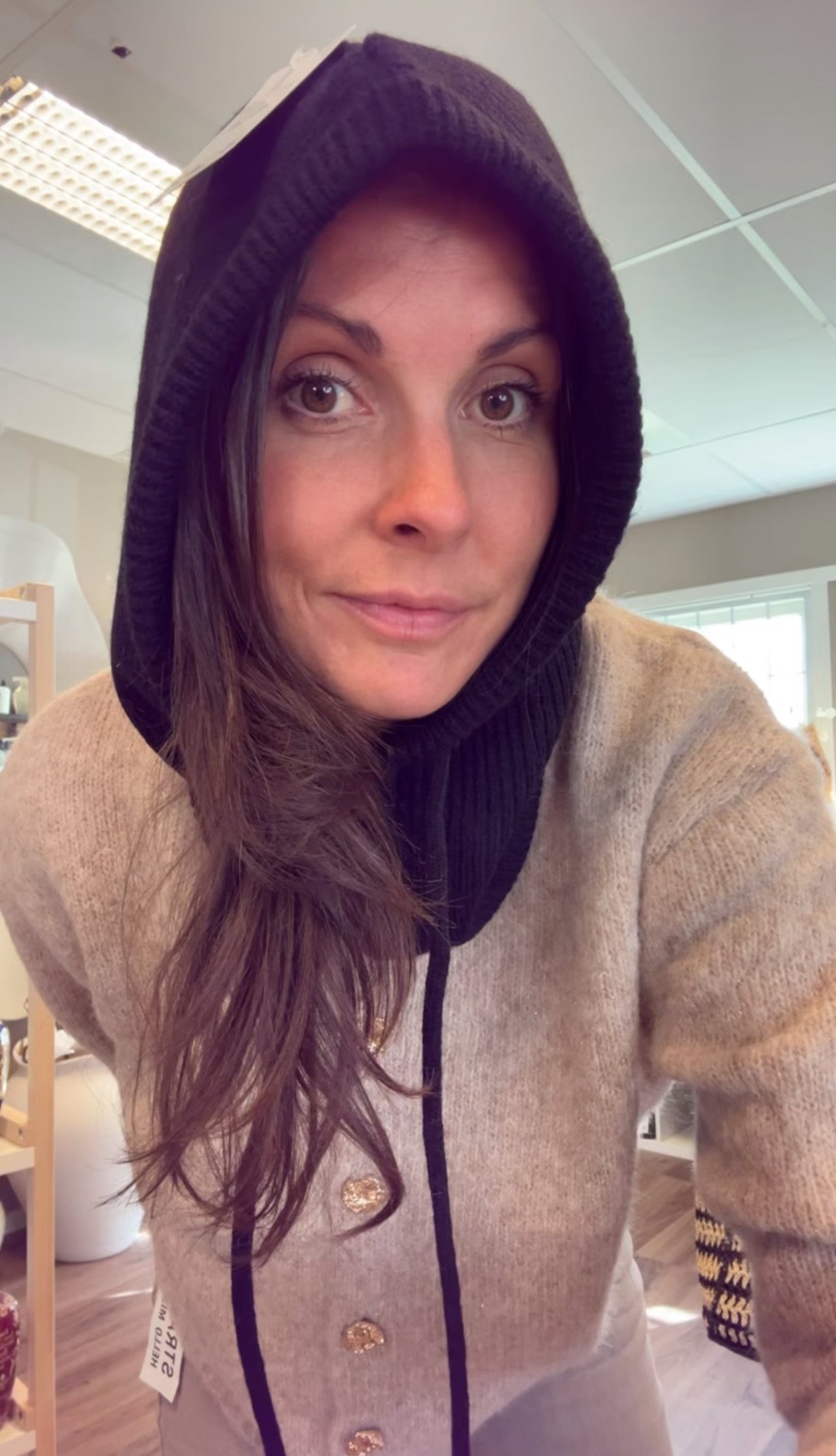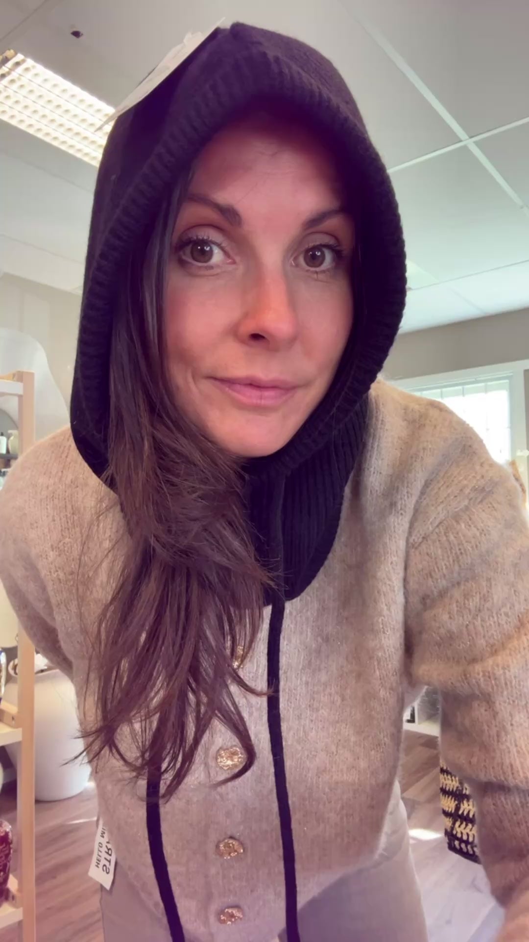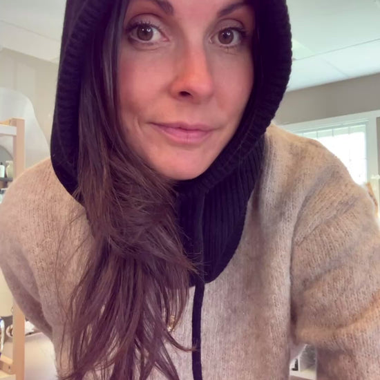 Stickad balaklava med knytsnören är värmande för både huvudet och halsen.