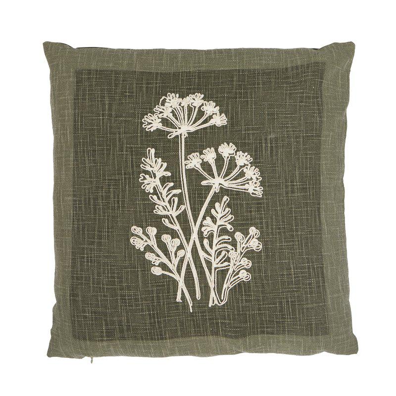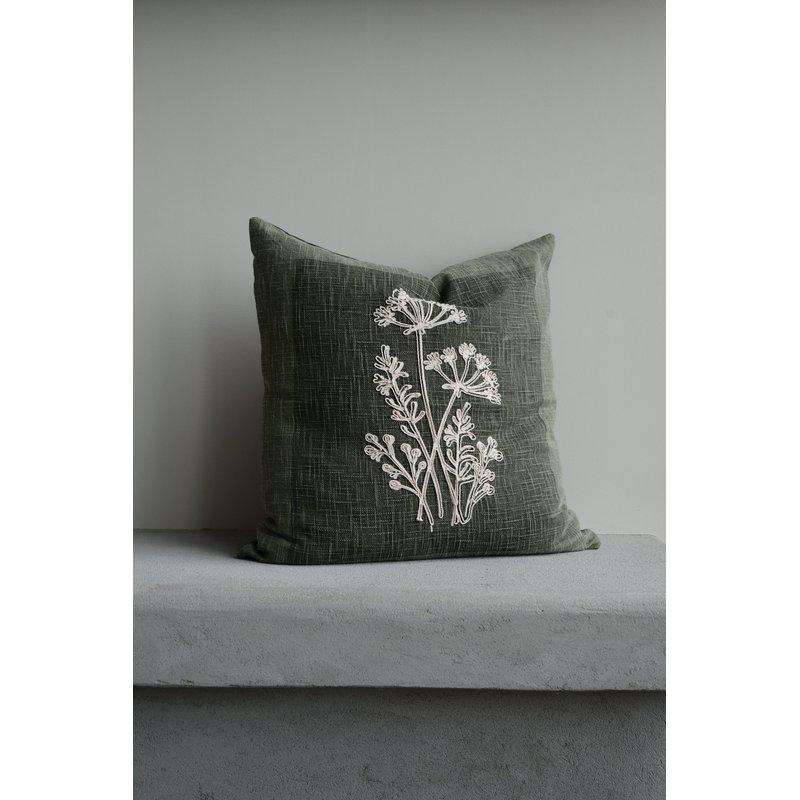 Kuddfodral i grov bomullsslub där framsidan har en tryckt botten som ger djup åt designen och dessutom har den ett broderat mönster som tillför en hantverkskänsla. Den enfärgade baksidan skapar balans och gör att kuddfodralet är lätt att matcha med andra kuddar