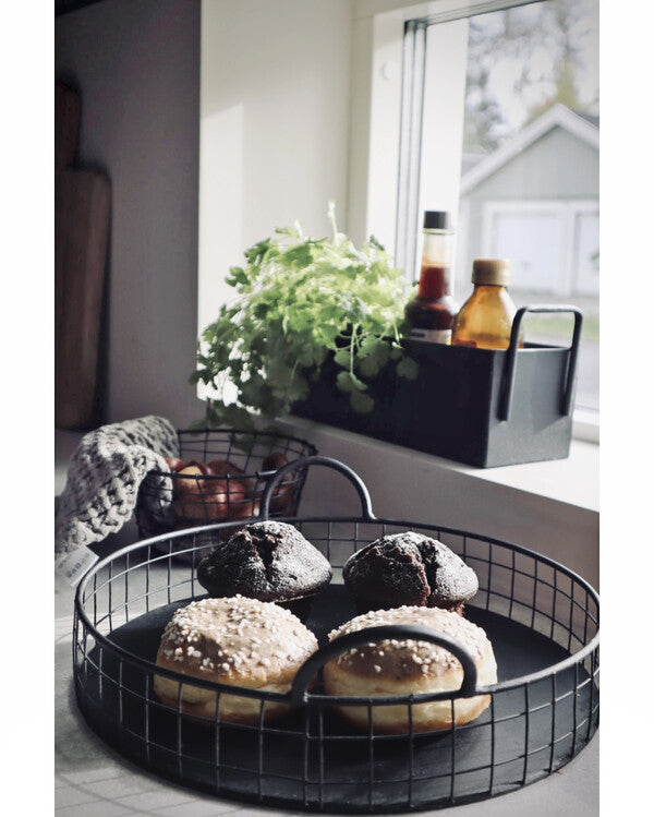Mångsidig och dekorativ metallbricka. En bricka att använda på olika sätt, att servera sina gäster eller att ha som dekoration med ljus och blommor på.
