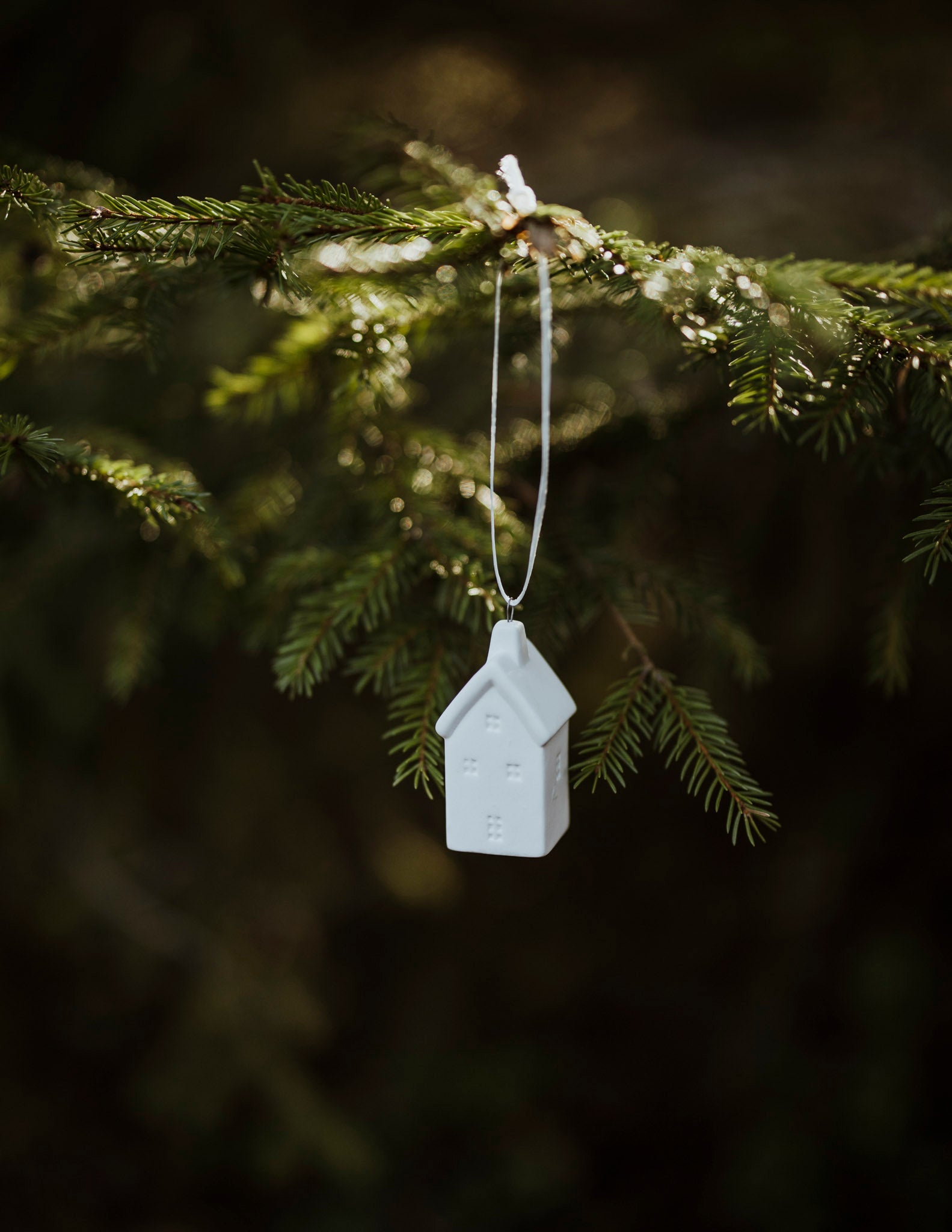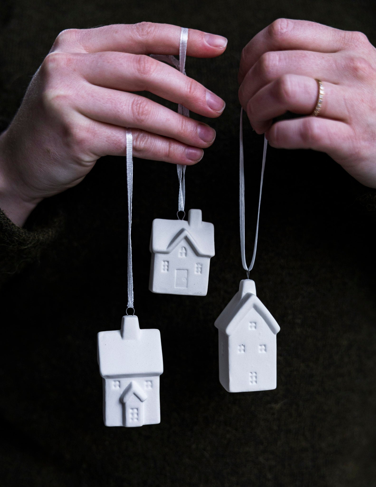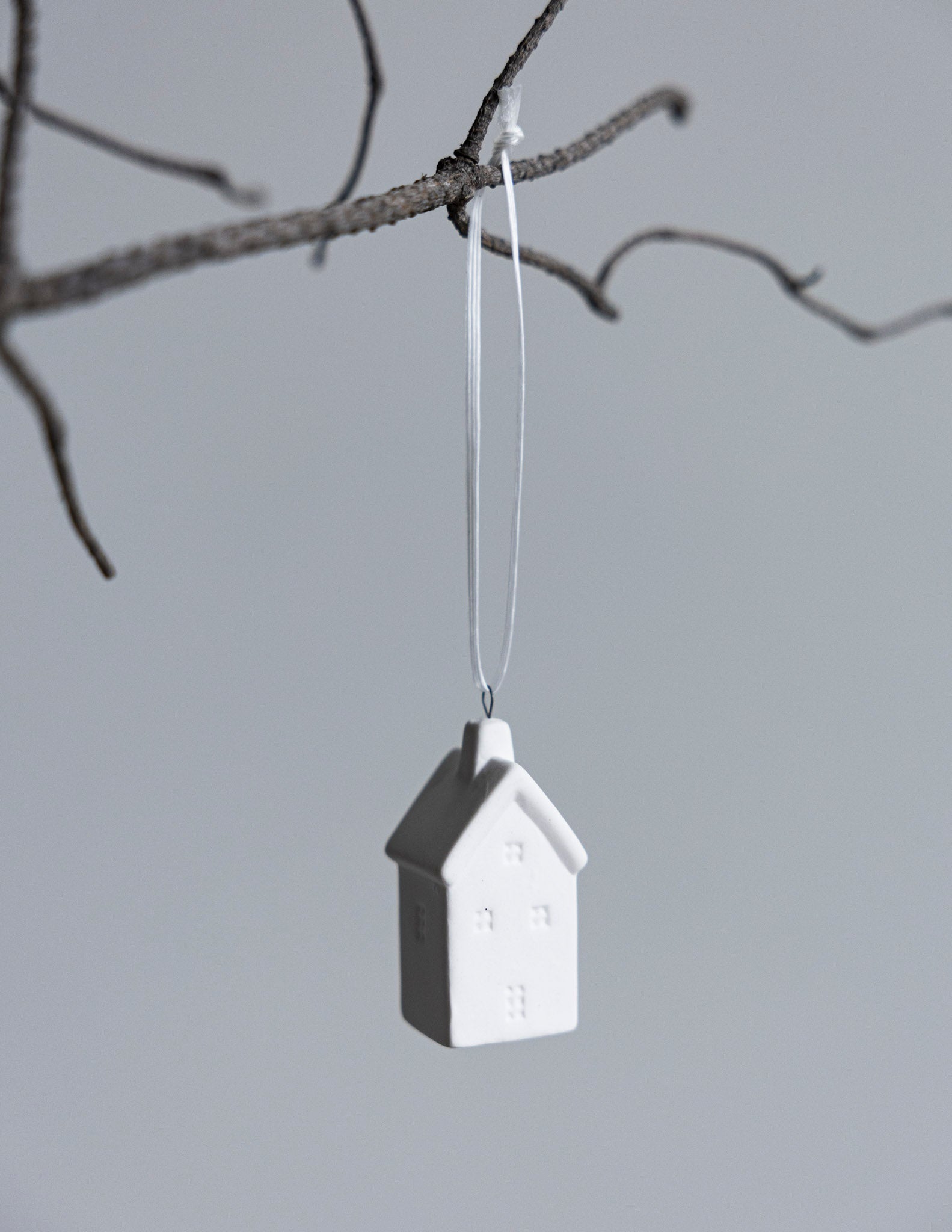 Hängande dekoration i matt keramik. Litet hus som passar att hänga i granen eller runt en krok.