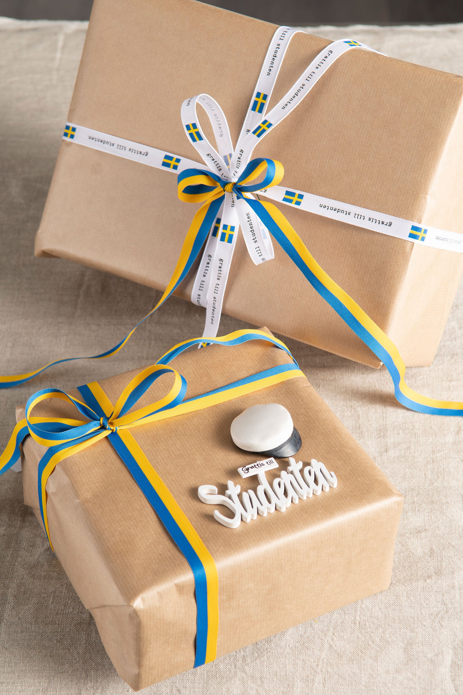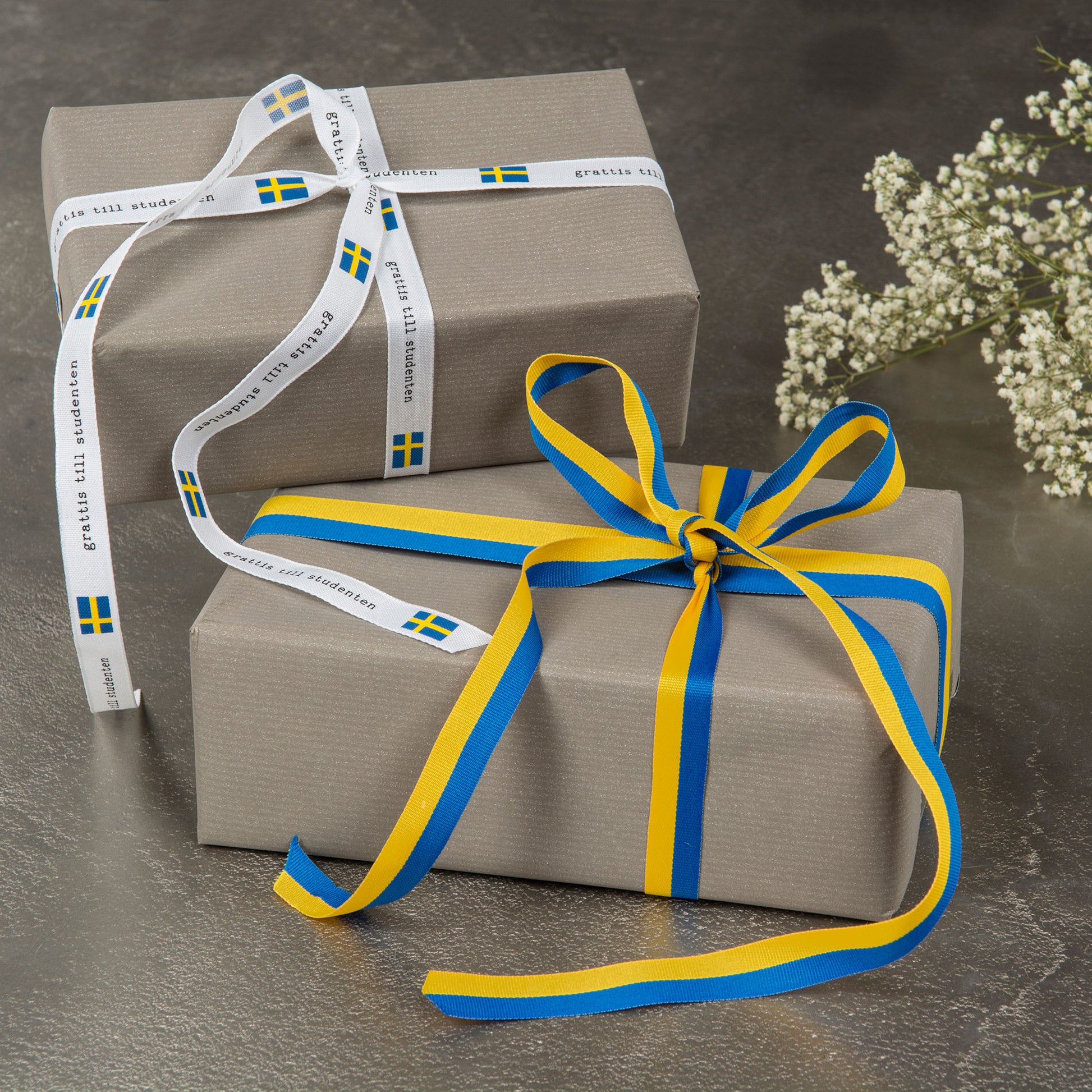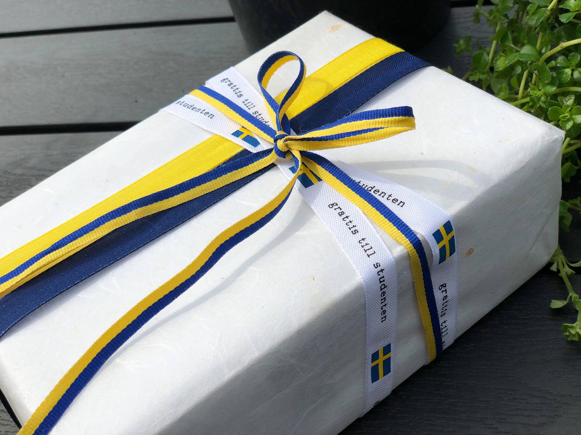 Blågult dekorationsband i textil som också är vattentätt. Perfekt för studentpresenten eller runt buketten.