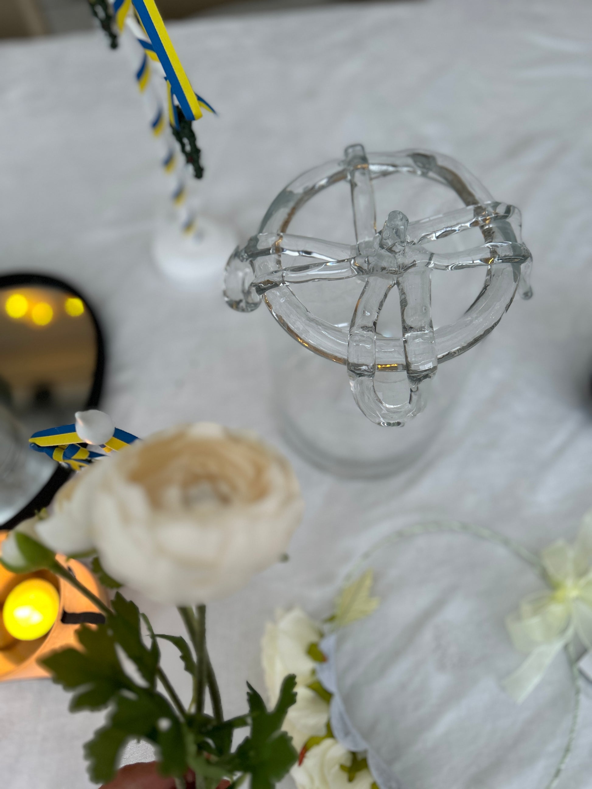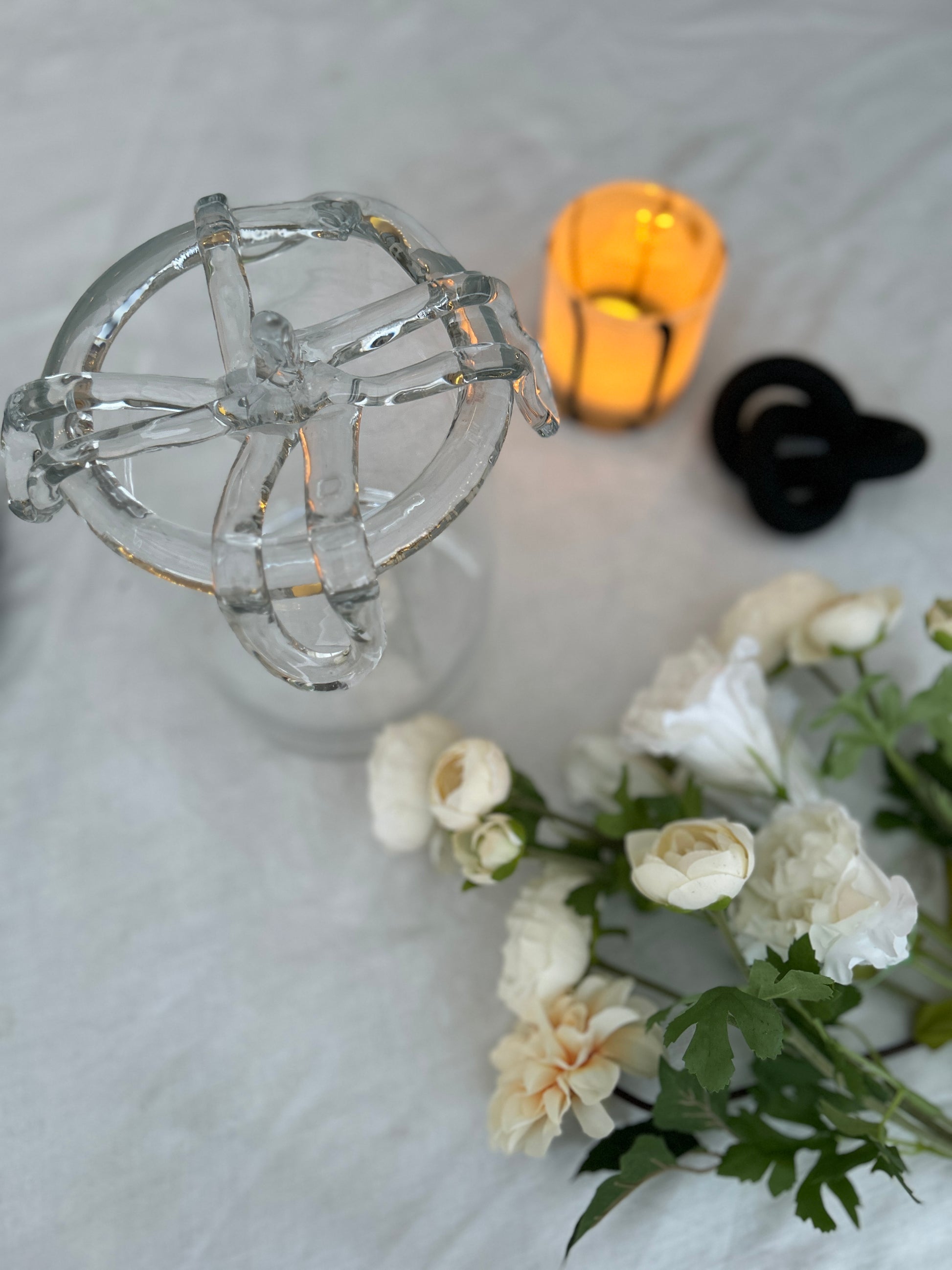 En cylinderformad vas med en dekorativ glasblomma som får blomman att stå stadigt i vasen. Istället fr en blombukett kan du placera ett LED-ljus och skapa en fantastisk ljusstake.