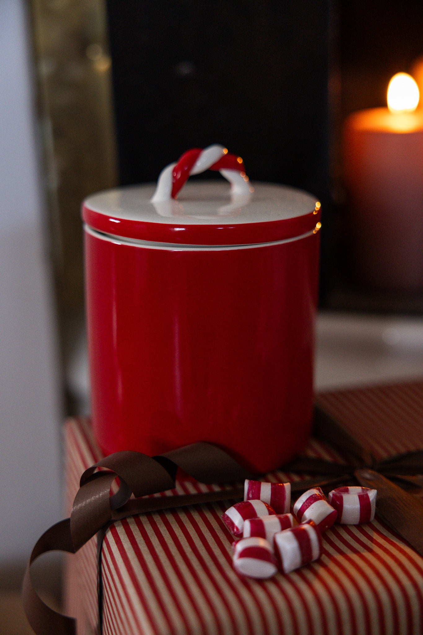 Polka-burk i röd färg skapar den perfekta julstämningen. Enkel men charmig, och perfekt för att förvara julgodis, te eller smådelikatesser. En fin och funktionell detalj som gör dina julstunder ännu mysigare.