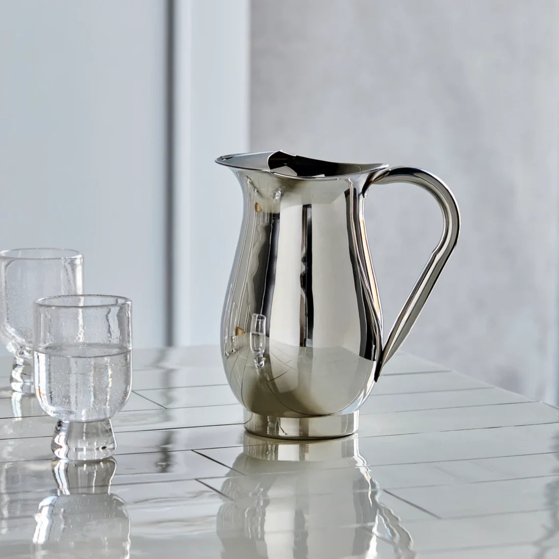 Denna handgjorda kanna i tidlös silverfinish ger omedelbar elegans och funktion till ditt bord. Tillverkad av rostfritt stål med en mjukt rundad form och ett elegant handtag, smälter den enkelt in i både klassisk och modern porslin. Använd den för att servera vatten vid middagar, som ett iögonfallande föremål på din bardisk eller som en dekorativ accent fylld med färska blommor.