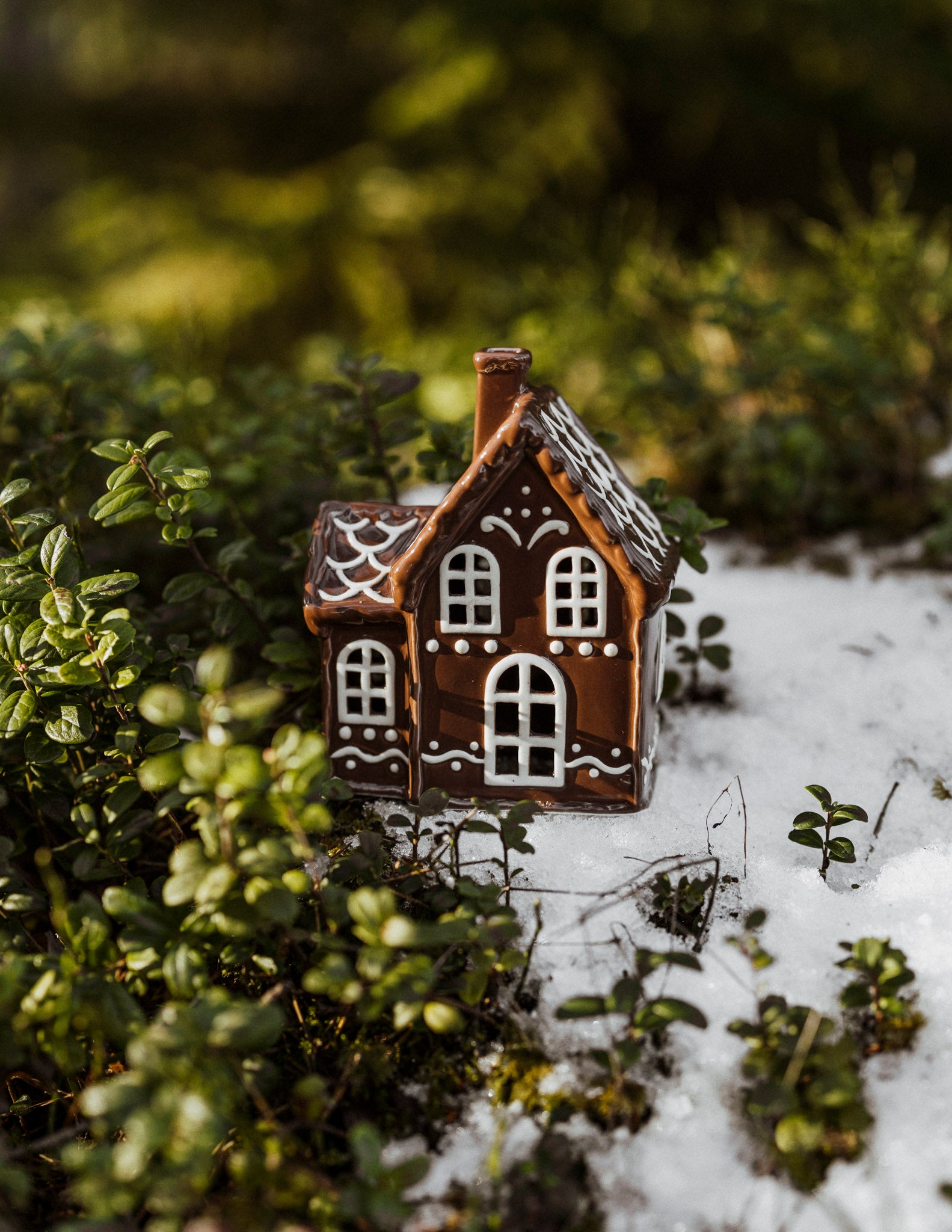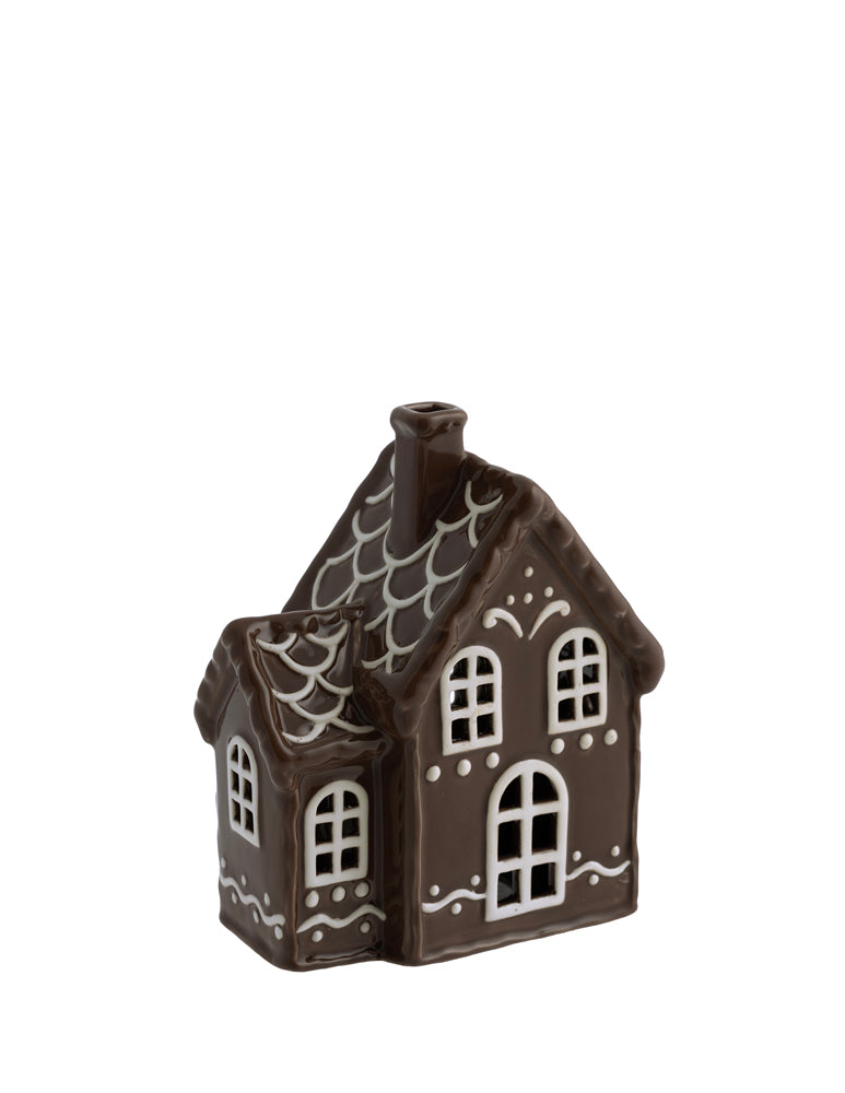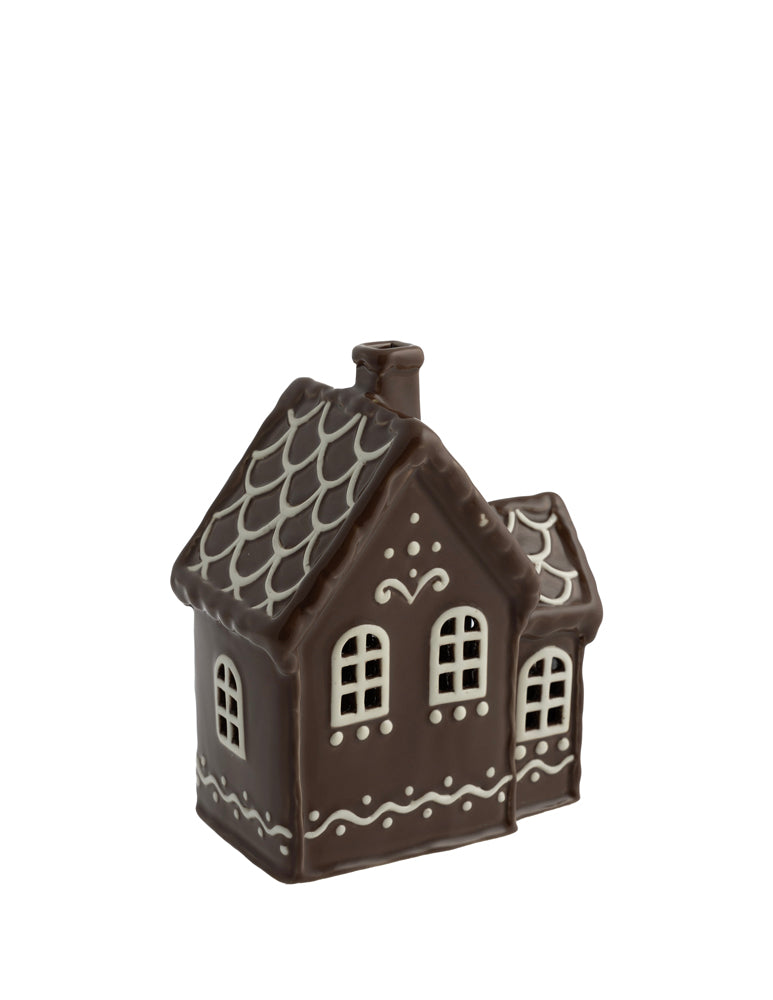 Pepparkakshus i glaserad keramik. Lys upp dem genom att placera en ljusslinga inuti dem.