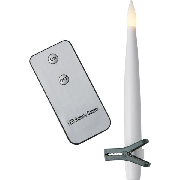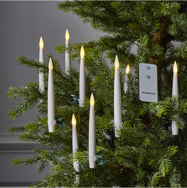 Trådlös julgransbelysning med 10 vita granljus för inomhusbruk. Ljusen ser verklighetstrogna ut och ger ett fint varmvitt sken. Det medföljer gröna hållare och en fjärrkontroll.