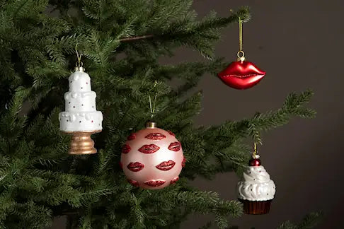 Julgranen får en lekfull touch med en hängande dekoration som ser ut som en tårta.