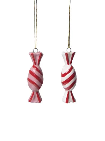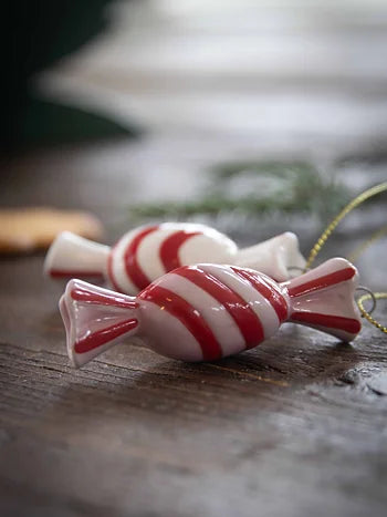 Klassiska julkarameller i rödvitrandig keramik, perfekta att hänga i granen eller lägga som dekoration på ett paket. Söt nostalgi med modern finish.