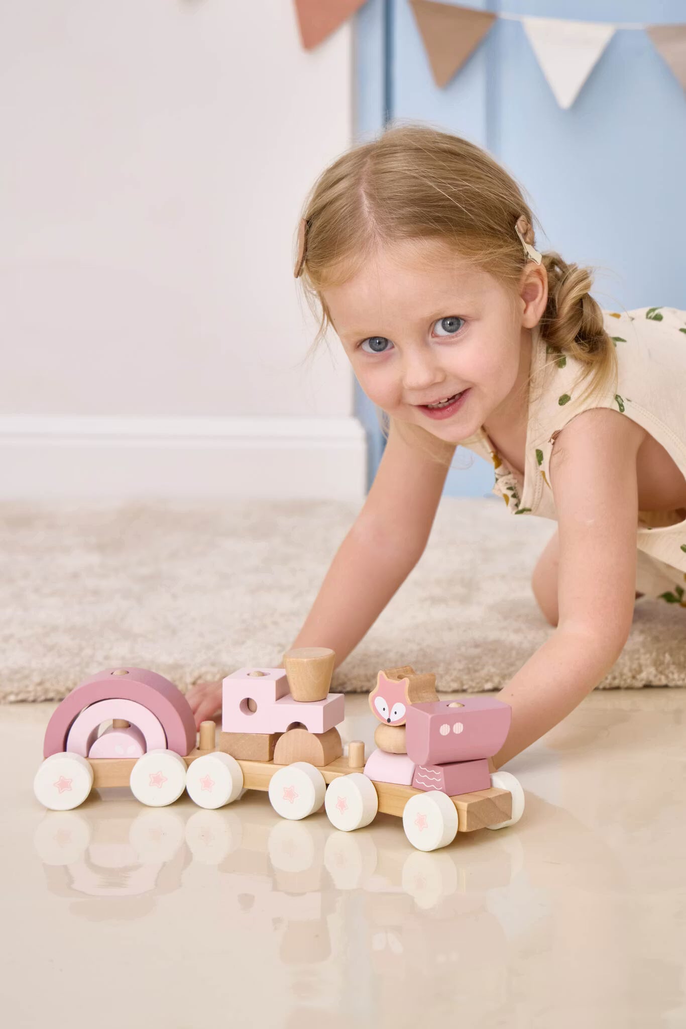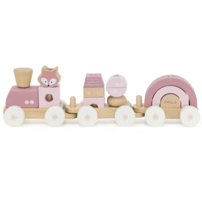 Detta klosståg är en fin dragleksak i form av ett tåg. Tåget består av ett lok och två vagnar som alla kan kopplas ihop. Tåget byggs upp i olika konstellationer av de fina färgglada klossarna med djurmotiv. Att bygga med klossarna är ett bra sätt för små barn att träna på deras finmotorik samtidigt som de får massor av skoj när de drar tåget över golvet.