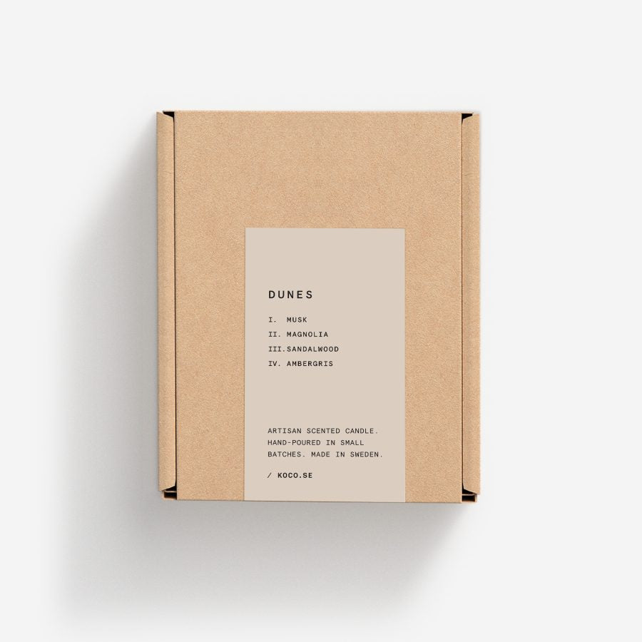 Dunes viskar öknens hemligheter i skymningen, med mysk, magnolia, sandelträ och ambra som förenas för att skapa en gåtfull doft. Detta ljus är en hyllning till sandens mystiska skönhet och erbjuder en varm och inbjudande glöd till dina kvällar.