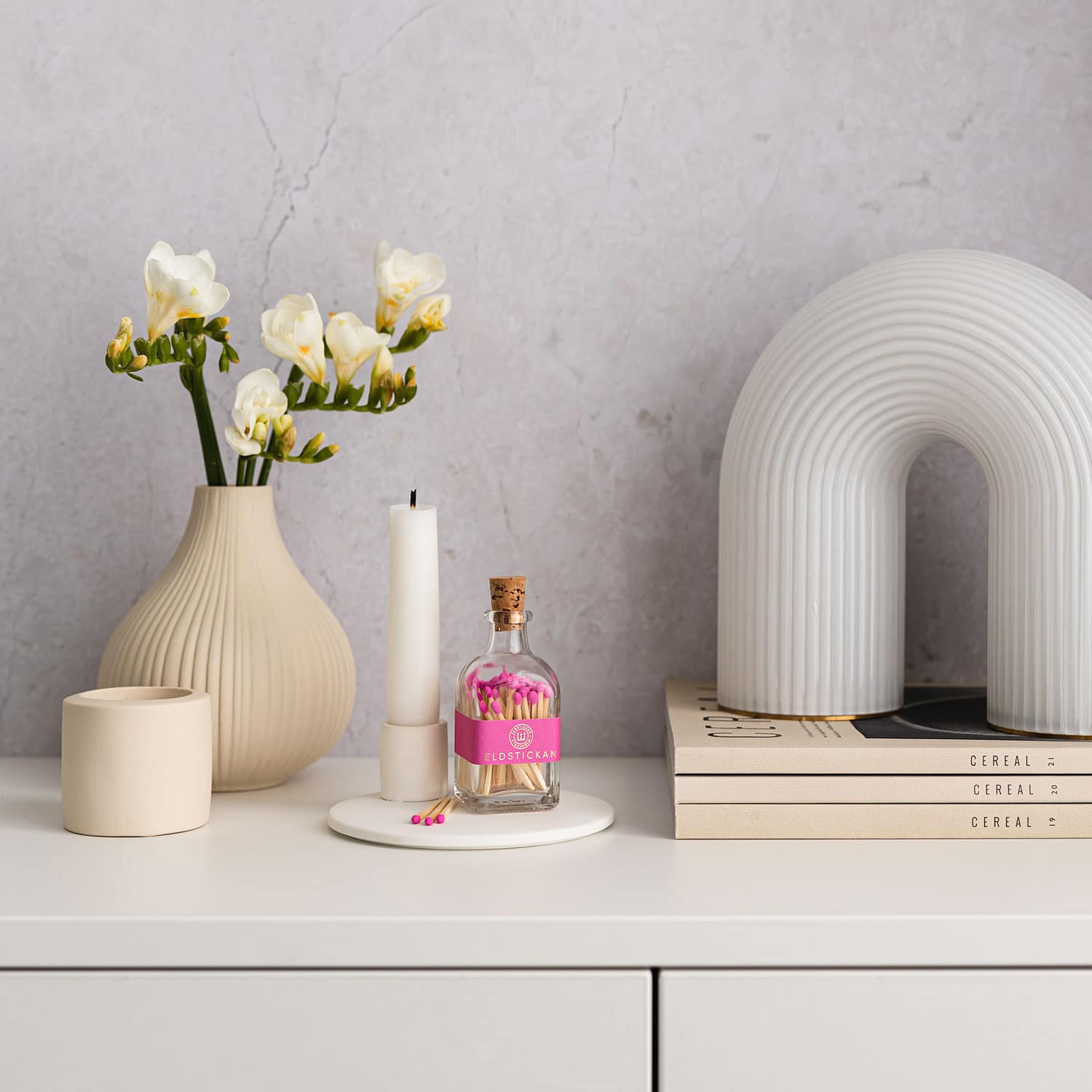 Lilla Eldstickan rymmer ca 60 tändstickor av standardstorlek och har plån på baksidan av flaskan. Den eleganta glasflaskan sätter en personlig prägel på ditt hem.