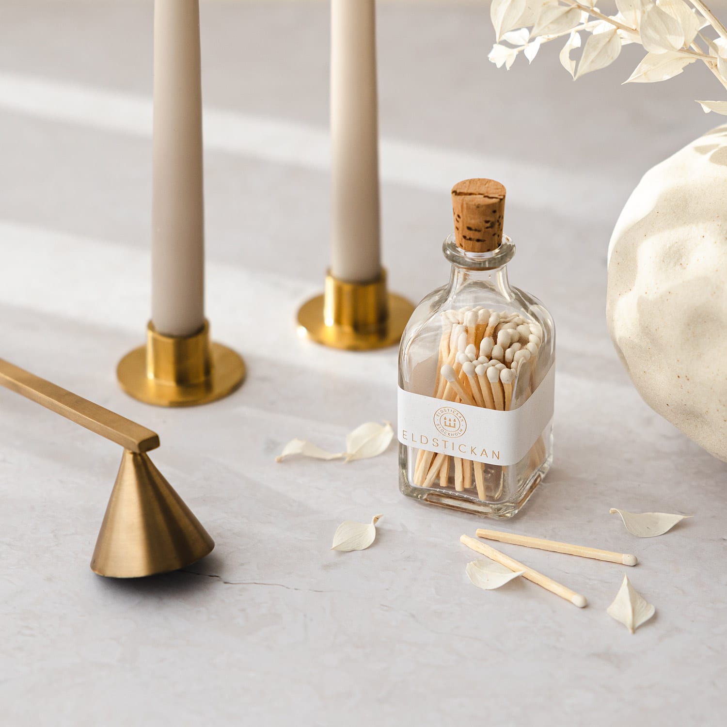 Lilla Eldstickan rymmer ca 60 tändstickor av standardstorlek och har plån på baksidan av flaskan. Den eleganta glasflaskan sätter en personlig prägel på ditt hem.