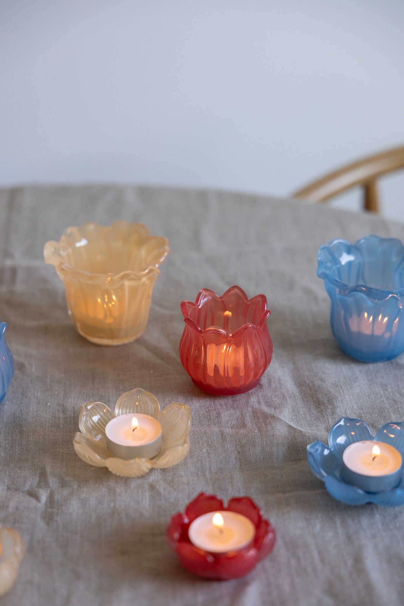 Färgad glaslykta med inspiration från en blomma. Med sin unika design och vackra färg sprider den en varm och inbjudande känsla.