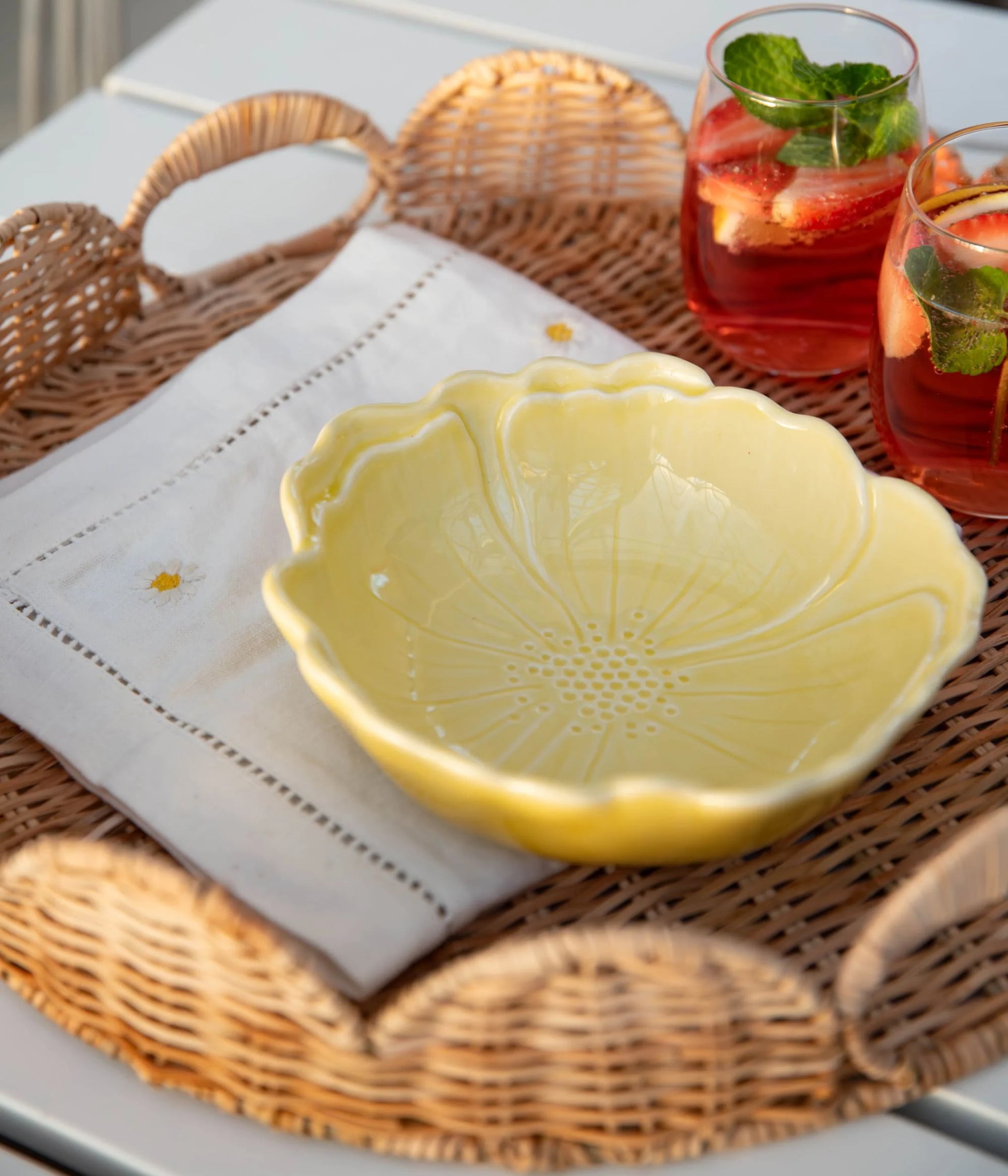 Denna vackra skål är handmålad med omsorg och prydd med ett lugnande, stilrent motiv. Perfekt för att servera sallader, pasta eller frukt, samtidigt som den fungerar som ett dekorativt inslag på bordet. Dess klassiska design gör den till en mångsidig del av din dukning, oavsett om det är vardag eller fest.