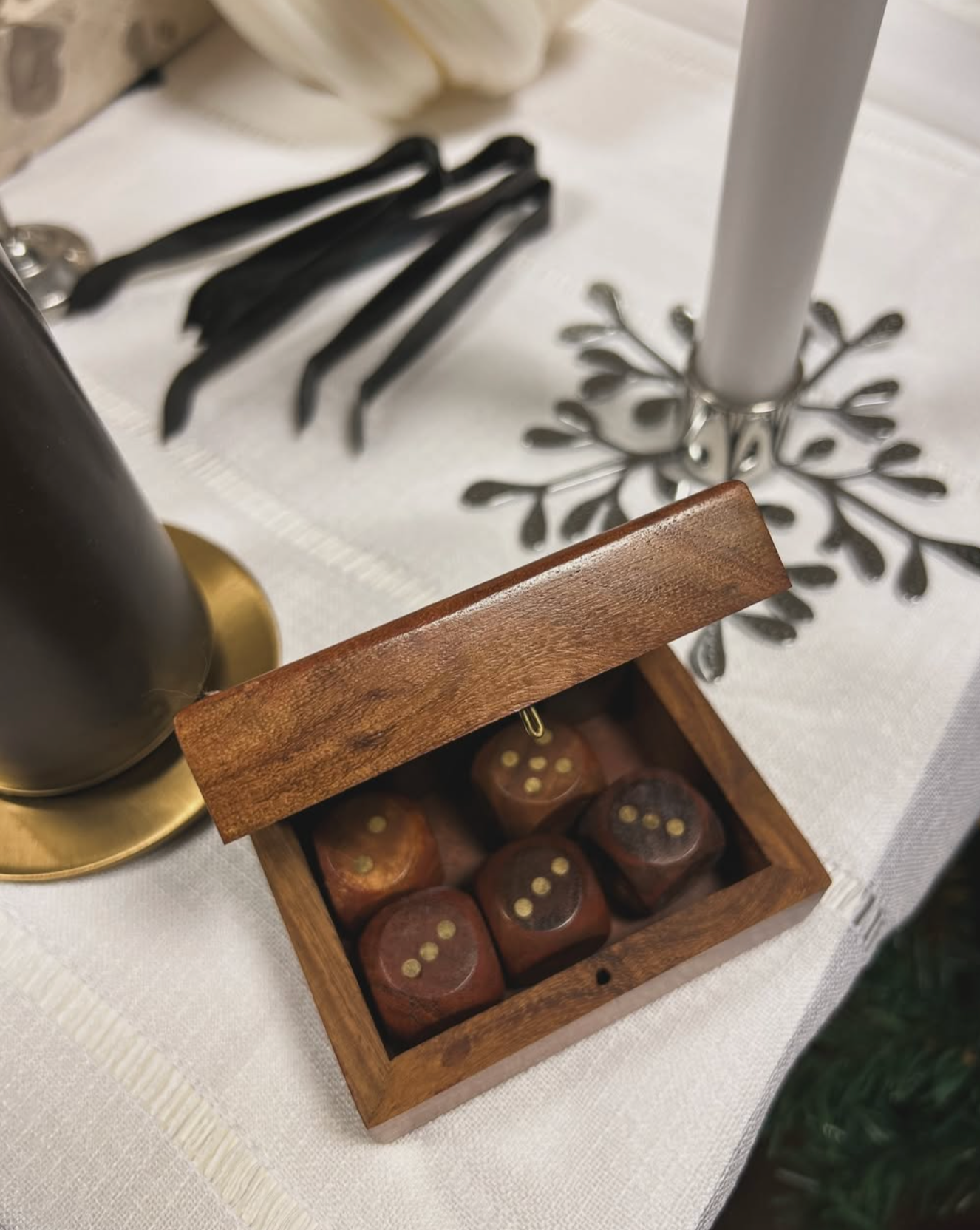 En ask i trä med 5 tärningar. Handgjord känsla och vackert ådrat material. Den är både praktisk och dekorativ, med ett litet lock som sluter tätt och skyddar dina tärningar. Perfekt för brädspelaren som uppskattar både funktion och estetik.