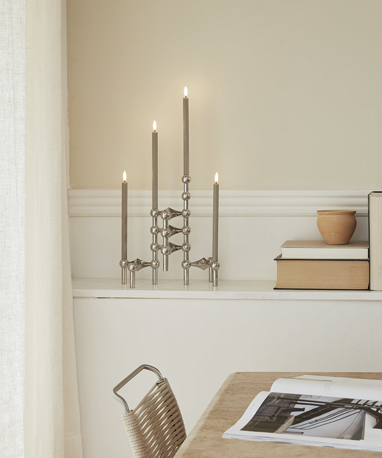 STOFF Nagel LED-ljus från Uyuni Lighting förenar längre hållbarhet, bättre inomhusklimat, säkerhet och skönhet i ett ljus. De är tillverkade med en 3D elektronisk låga som försiktigt flimrar och skapar ett mjukt och inbjudande ljus i ditt hem som en riktig levande låga. Dessutom doppas ljusen för hand med en yta av jungfruligt paraffinvax för att de ska stå vackert och autentiska i ljusstakarna. Ljusen är batteridrivna med 2 st. alkaliska AAAA-batterier per LED-ljus (ingår ej) och kan styras med den inbyggda 6-timmarstimern. Om du vill släcka ljusen före den inbyggda 6-timmarstimern, skruva loss ljusens botten för att lossa batterierna. Använd fjärrkontrollen (säljs separat) för att styra alla dina LED-ljus samtidigt. Ställ in timern i intervaller på 4, 6, 8 eller 10 timmar och välj mellan 3-lägesdimmern. OBS: Använd AV-knappen på fjärrkontrollen för att ställa LED-ljuset i standby-läge. I standby-läge kommer ljuset fortfarande att använda lite batteri. Vrid loss botten för att släcka ljuset helt och förlänga batteriernas livslängd.