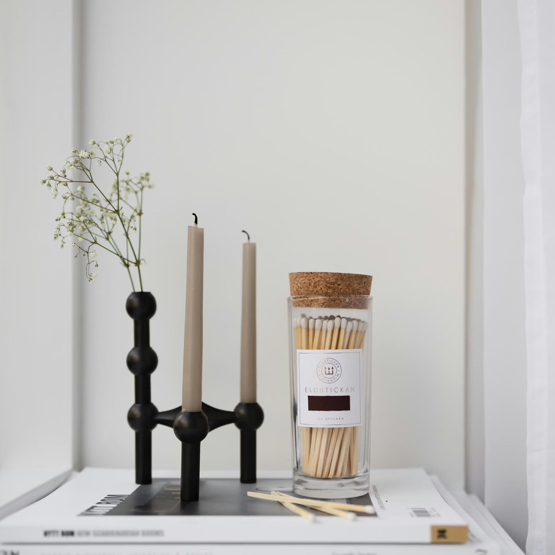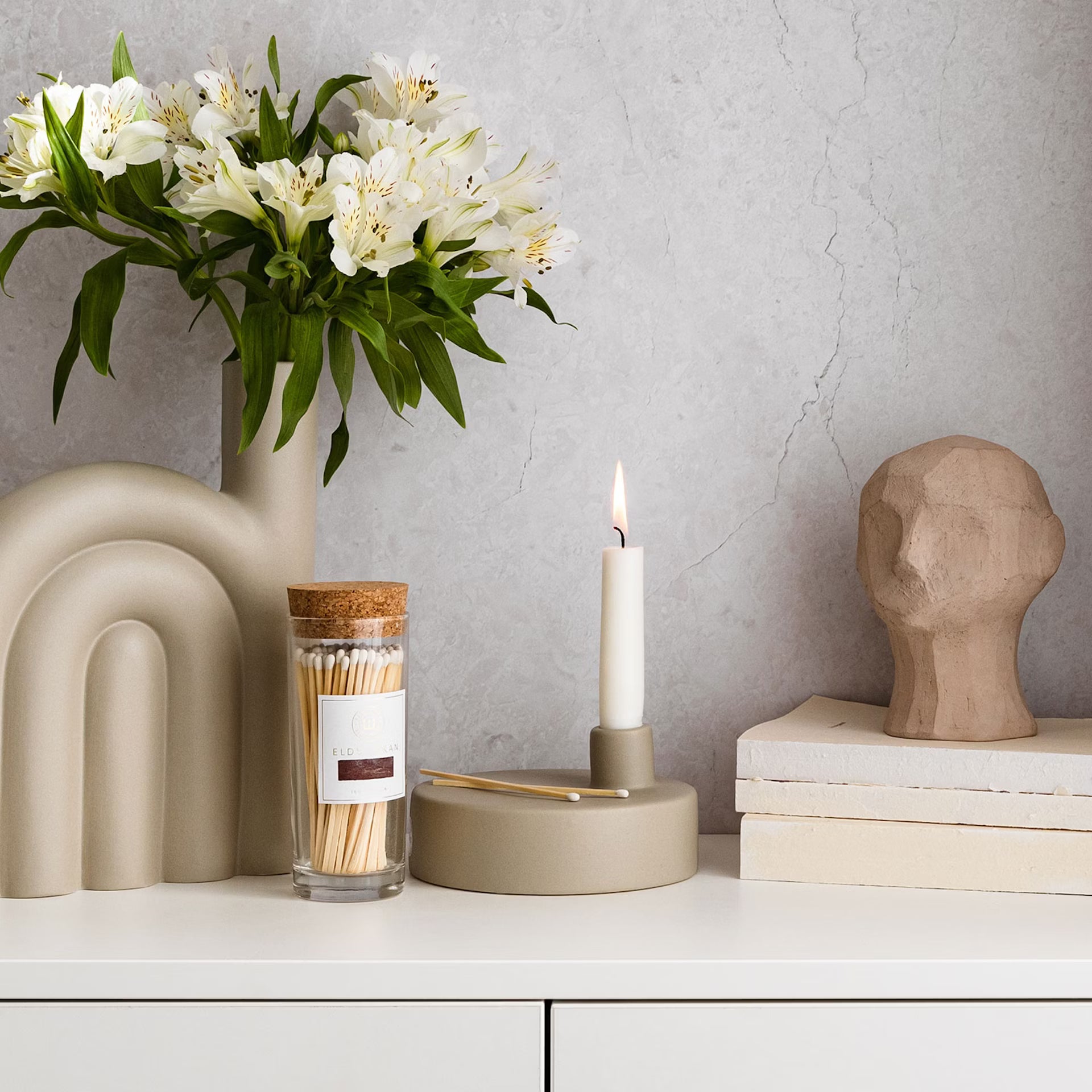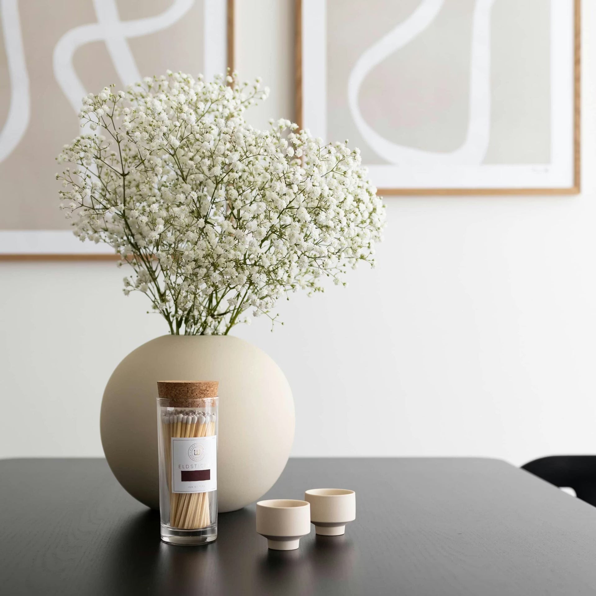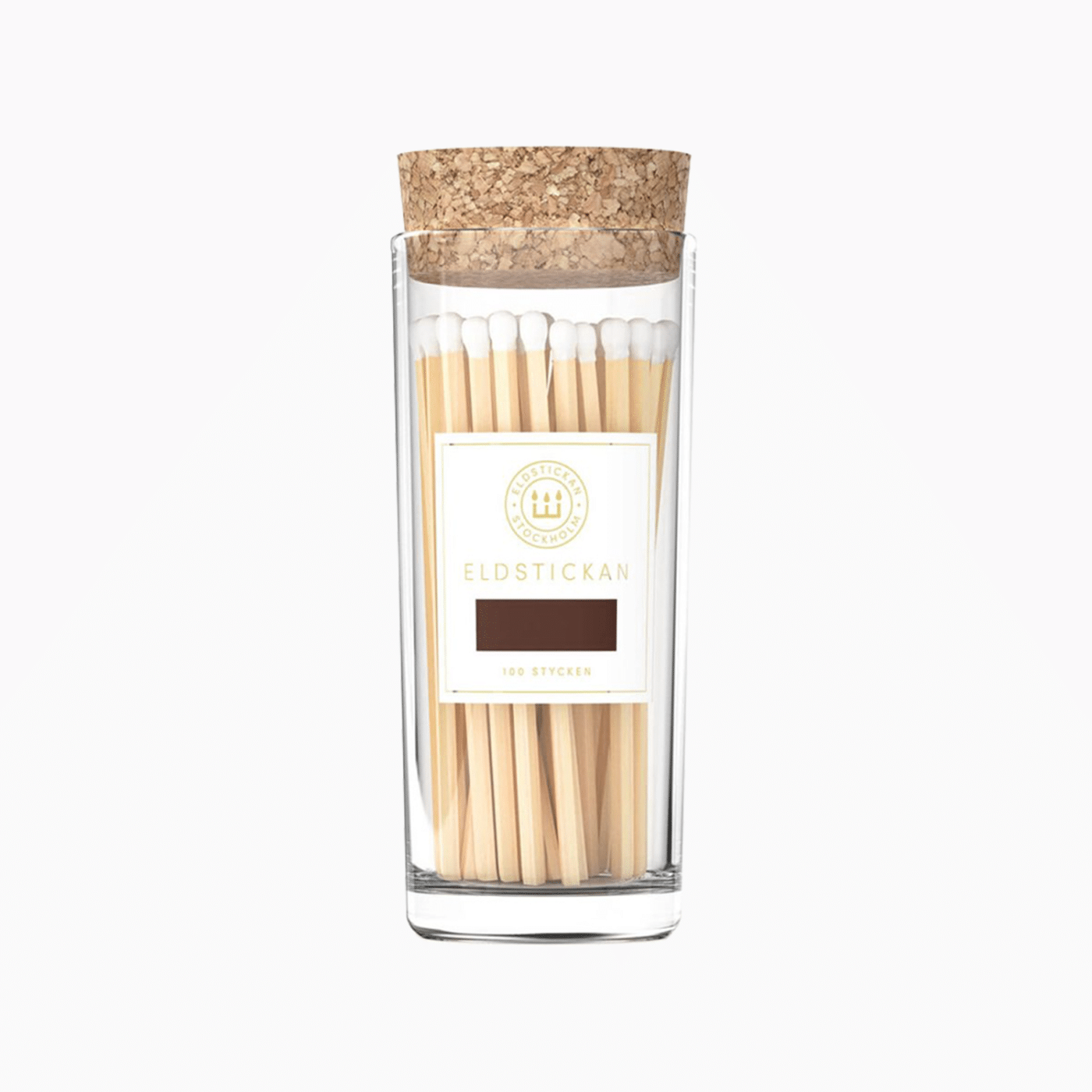 Stora Eldstickan Vit är en 15 cm hög, stilren glasbehållare med korklock, elegant vit etikett och långa stadiga stickor med vit topp.