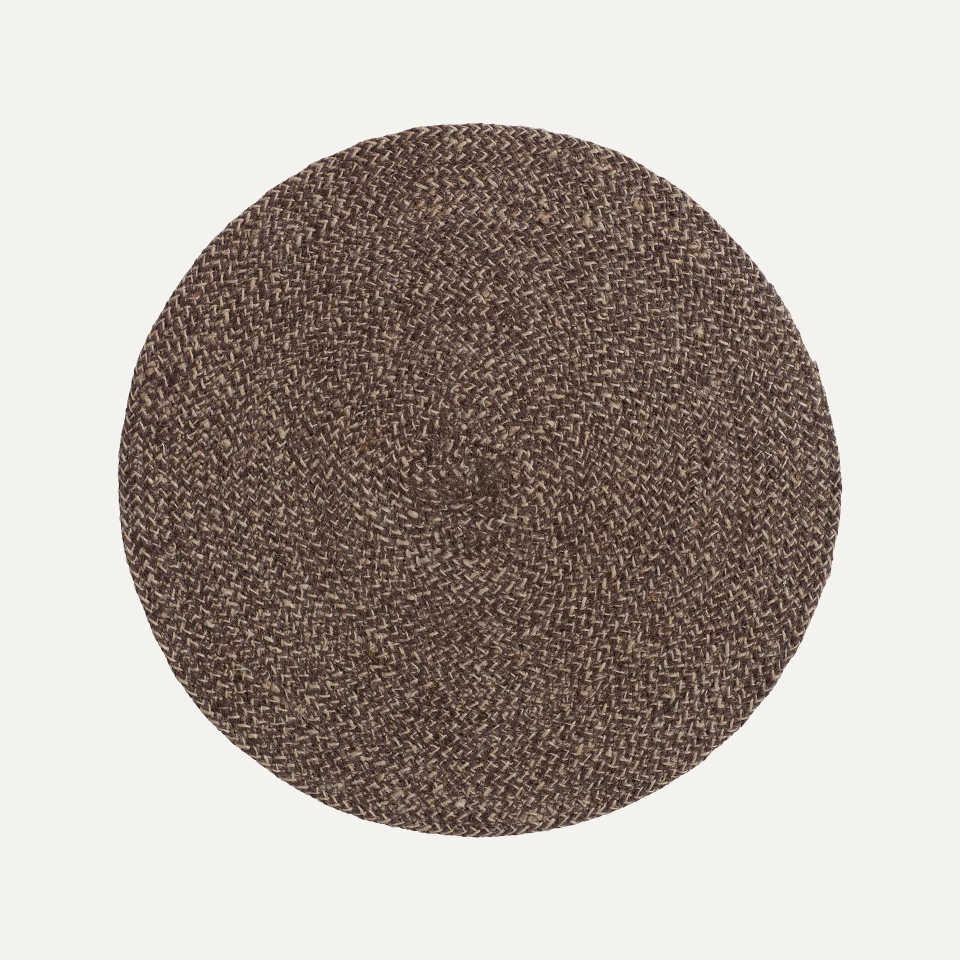 Handgjord rund, vändbar bordstablett av jute i en melerad i brun och natur.