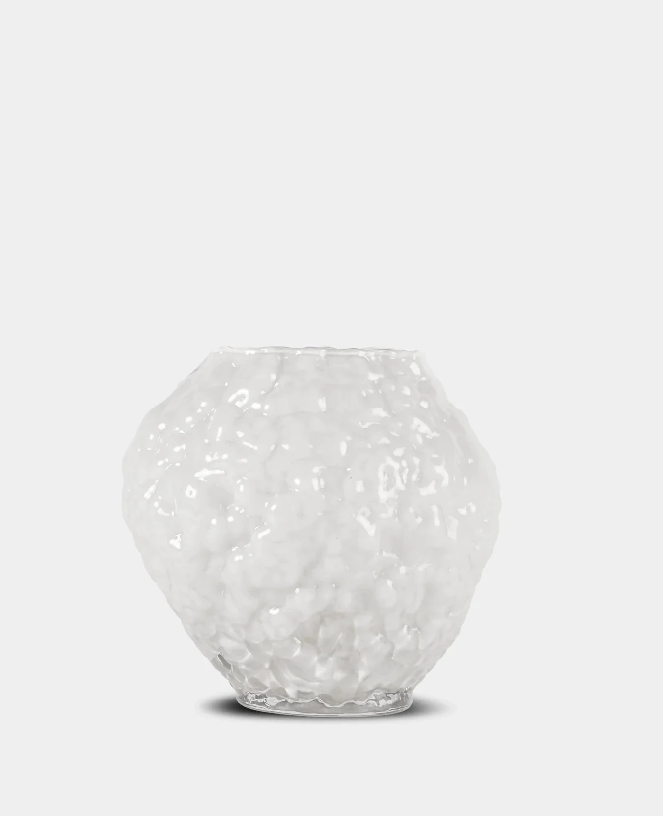 Strukturen i glaset är likt en korall på havets botten. Formen är oregelbunden och extravagant och tar självsäkert all uppmärksamhet i ett rum eller på ett bord. Färgen är krispigt vit i en spännande mjölkig finish. En perfekt vas för de kortare buketterna.